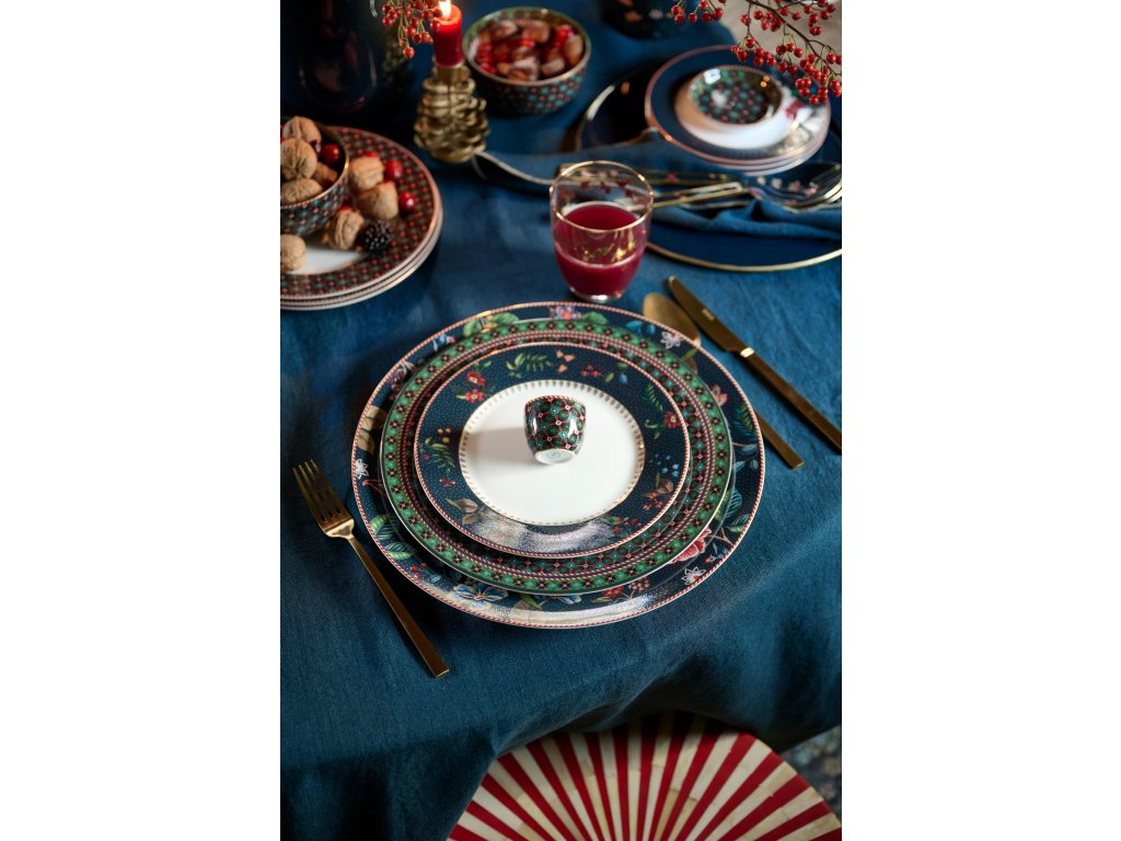 Kolekce Berry Blues v tmavě modro-zeleném provedení je inspirována hojností plodů a květů. Okraje zdobí jemný bílo-červený lem, který ladí s červenými detaily na květech a drobných plodech a dodává porcelánu elegantní kontrast.