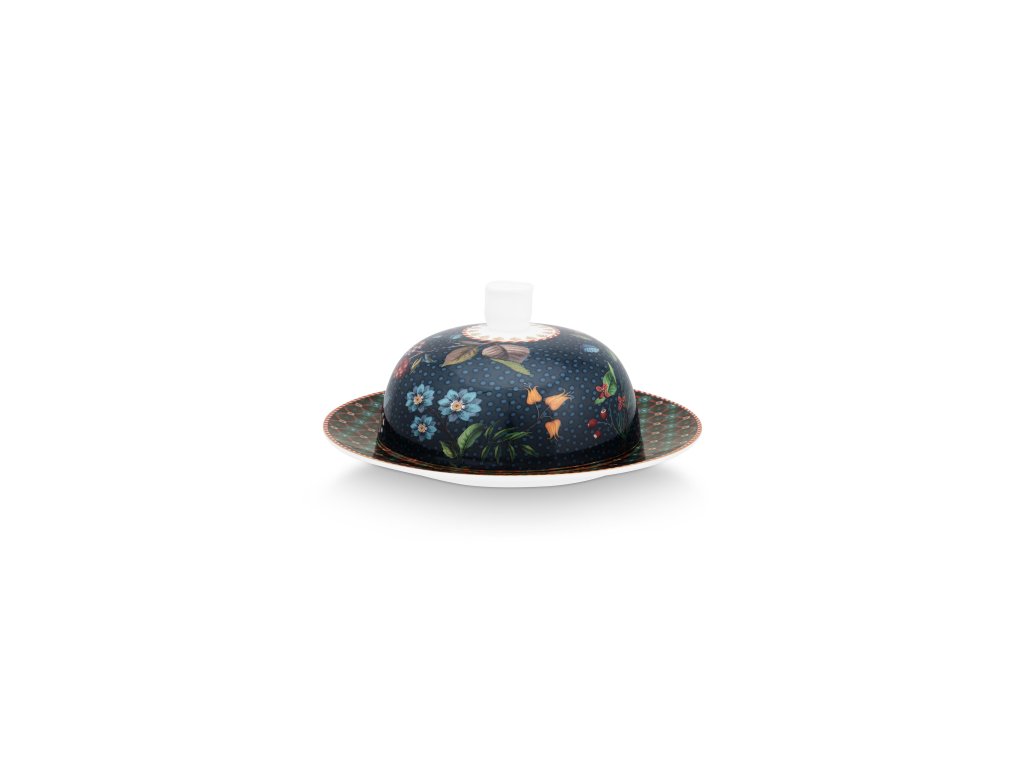 Víčko máselnice z kolekce Pip Studio Berry Blues zdobí úchytka ve tvaru růže a na talířku se schovává malé překvapení .