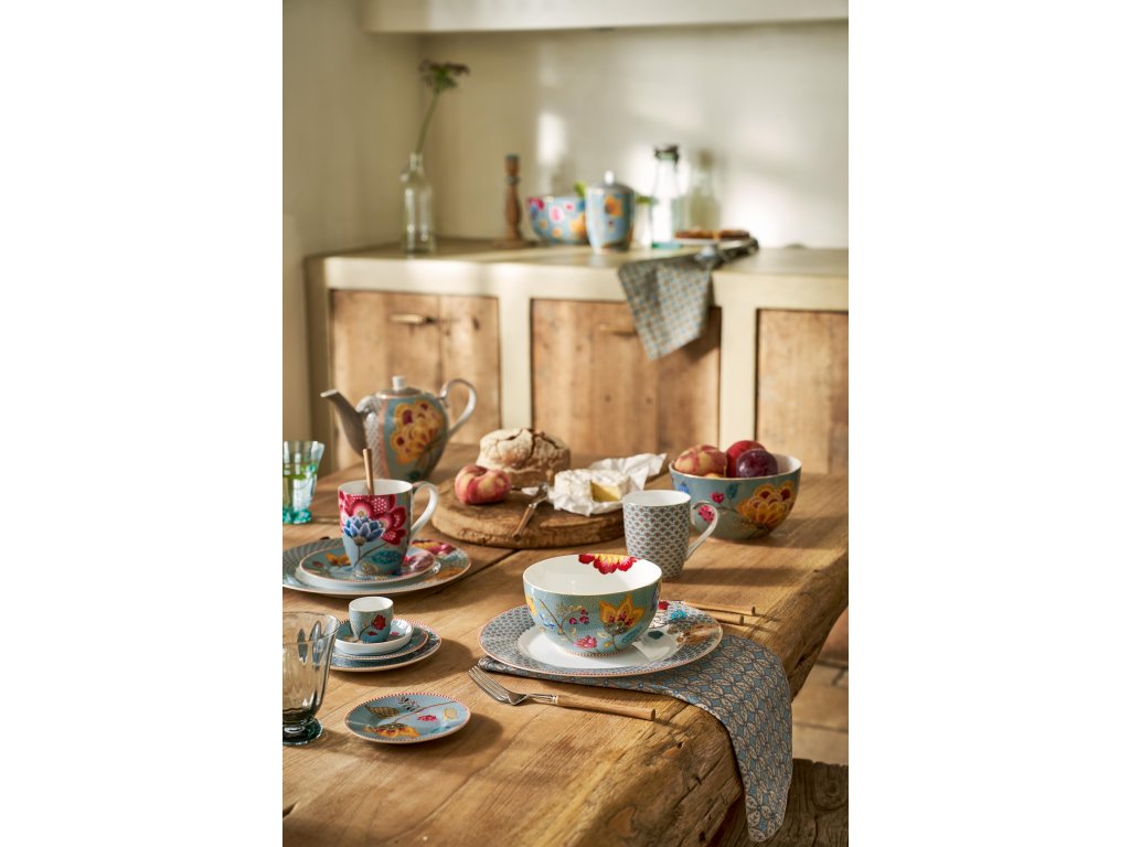 Snídaňový porcelánový set Pip Studio Blooming Tales Fantasy Blue 3 díly : talíř 21 cm, miska 15 cm a hrnek 350 ml v dárkovém balení.
