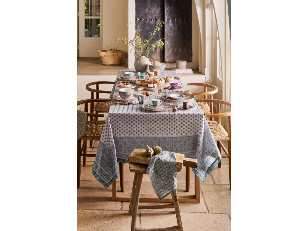 Bavlněný ubrus Pip Studio Blooming Tales Khaki/Blue s květinovým vzorem. Elegantní textil na každodenní i slavnostní stolování.