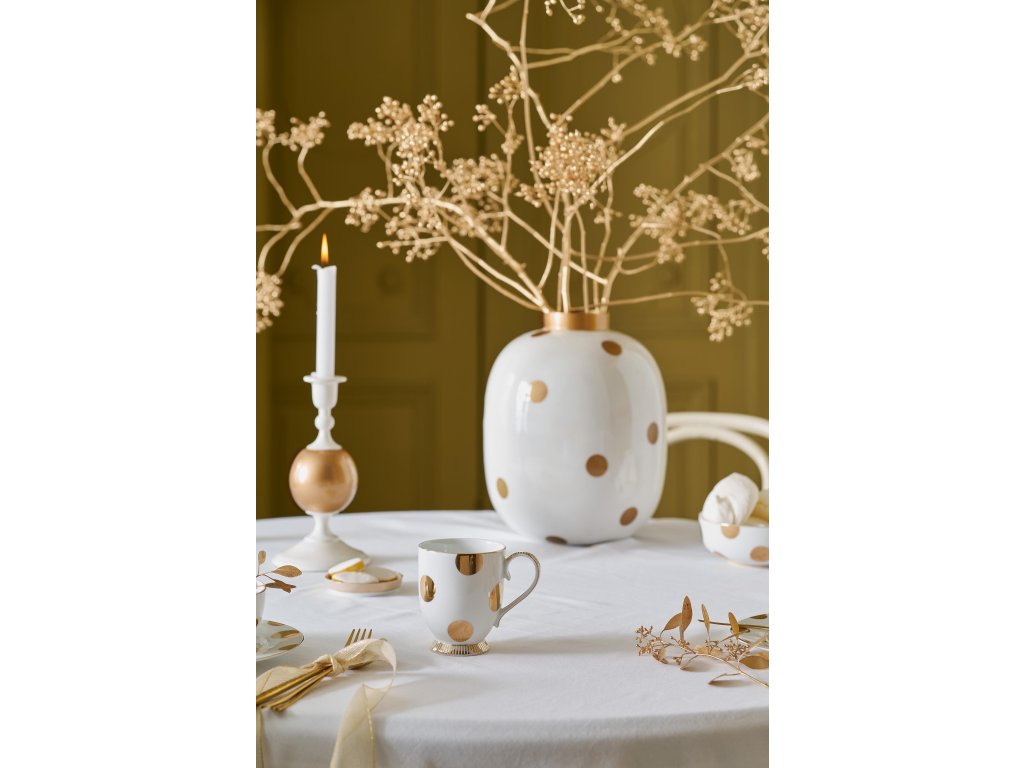 Dva bílé porcelánové hrnky Pip Studio Dot Delight se zlatými detaily a jemným designem, který spojuje eleganci s pohádkovým kouzlem. Dodáváno v dárkové krabičce.