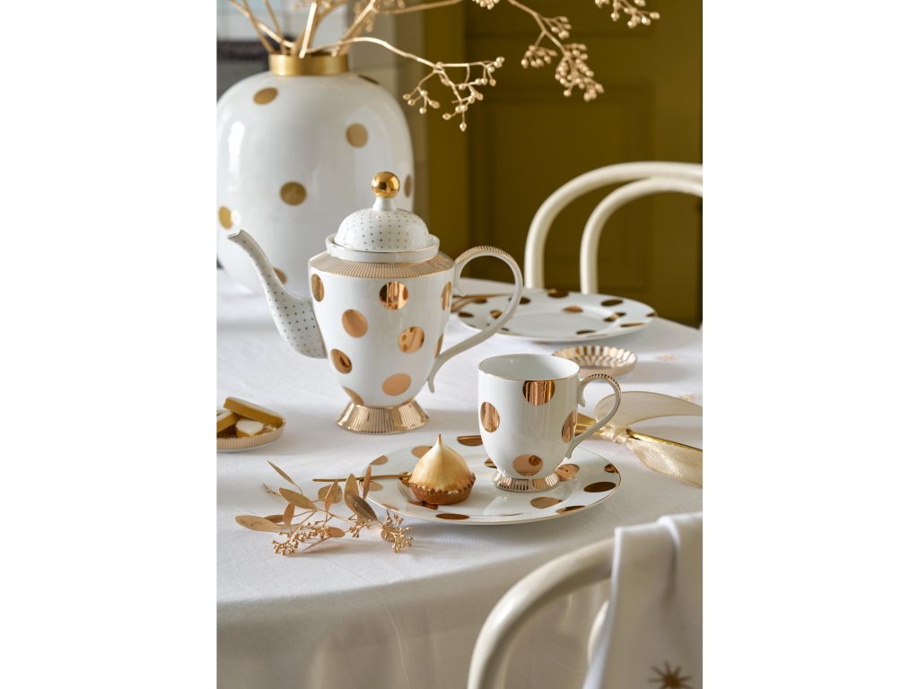 Kolekce Pip Studio Dot Delight přináší pohádkové kouzlo i do každodenních chvil. Tyto bílé porcelánové hrnky se zlatými puntíky září elegancí a jemným půvabem. Každý hrnek působí jako drobný šperk – velké puntíky, zlaté lemování a ladné tvary vytvářejí dojem, že pochází přímo ze zámecké komnaty. Perfektní volba pro chvíle, kdy si chcete vychutnat čaj či kávu se stylem.