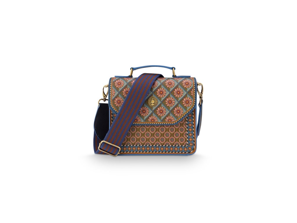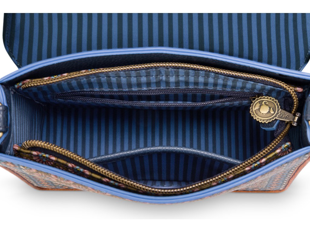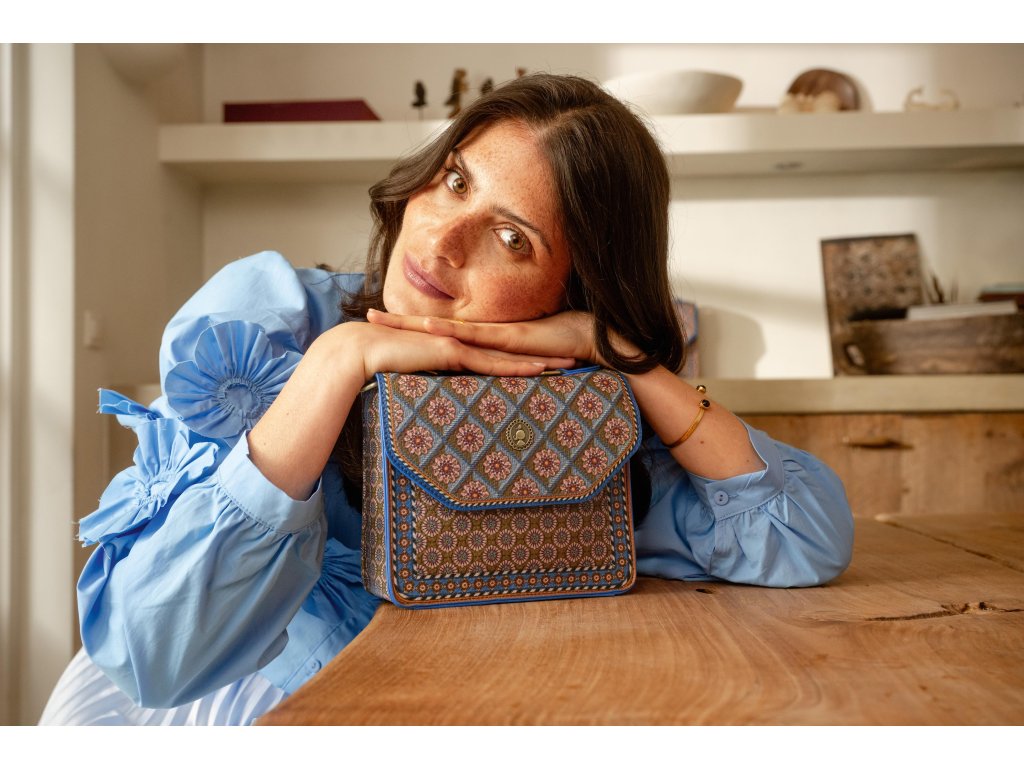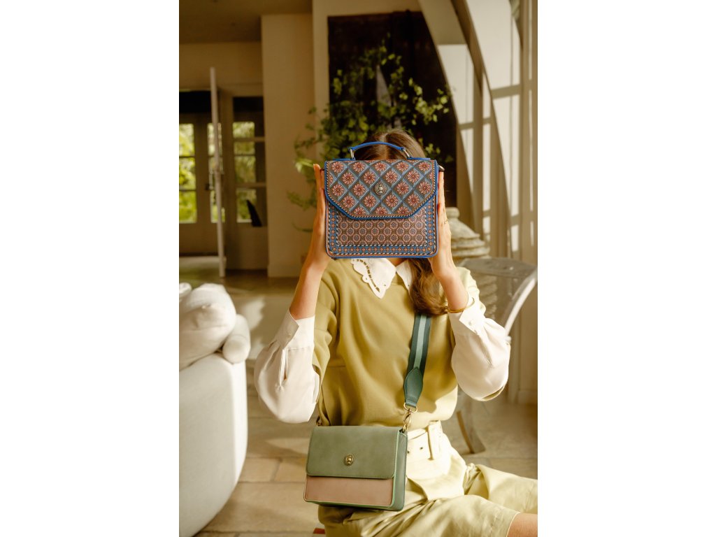 Design Imani je inspirován živými africkými vzory s geometrickými tvary a bohatou paletou barev. Hnědé, béžové a zemitě laděné tóny doplňuje sytá modrá, která kabelce dodává hravý a zároveň sofistikovaný vzhled.