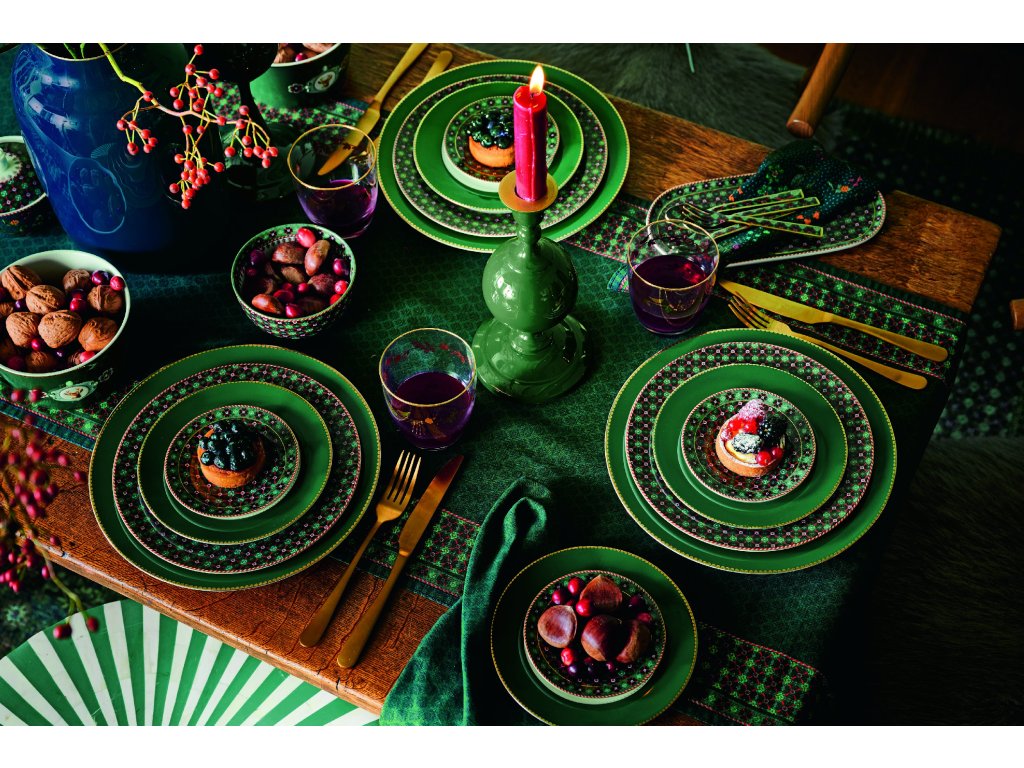 Pip Studio Love Birds Medalion Deer Green mělký talíř z ikonické kolekce Love Birds okouzlí svým tmavě zeleným okrajem se zlatými detaily. Ve středu talíře se vyjímá malý, hrdý jelínek, typický pro tuto kolekci. Skvěle se kombinuje s ostatními porcelánovými kousky z řady Love Birds. Pro výraznější a osobitější styling lze celek doplnit také o červené akcenty, které se obzvlášť hodí v zimním období a přirozeně podtrhnou sváteční atmosféru. Výsledkem je harmonická kombinace, která působí vyváženě a nadčasově.