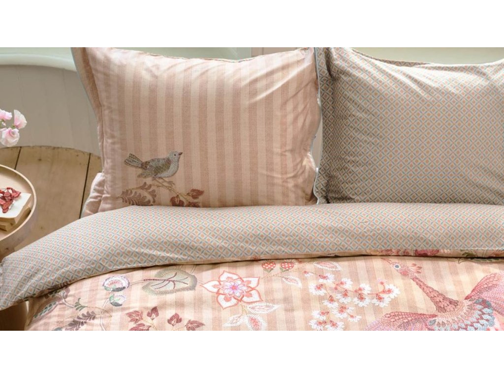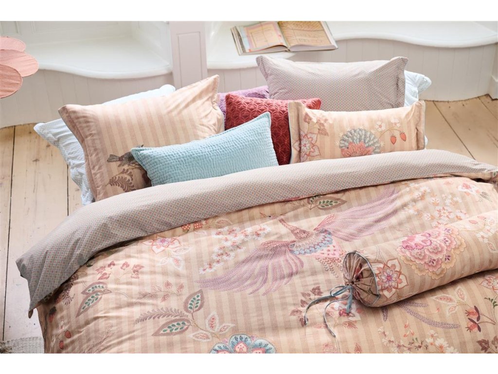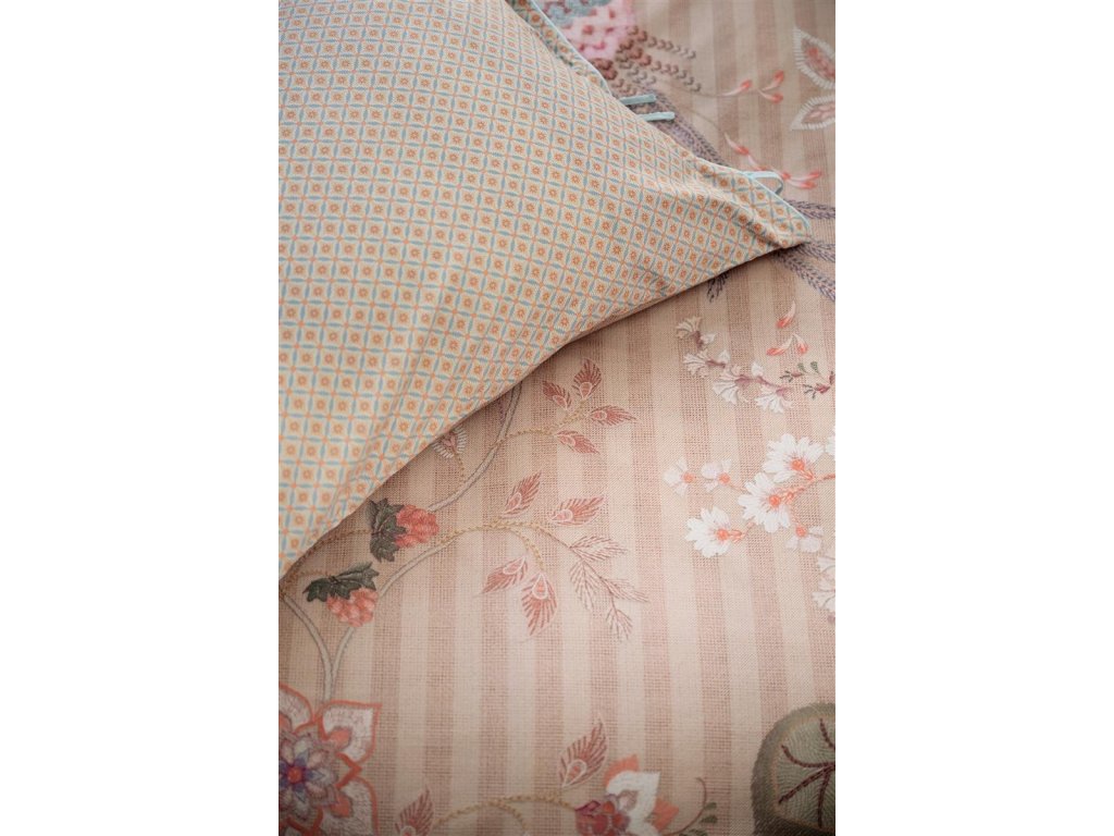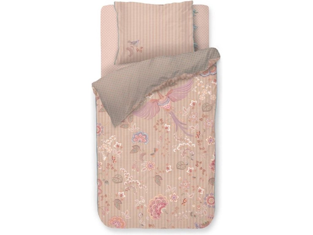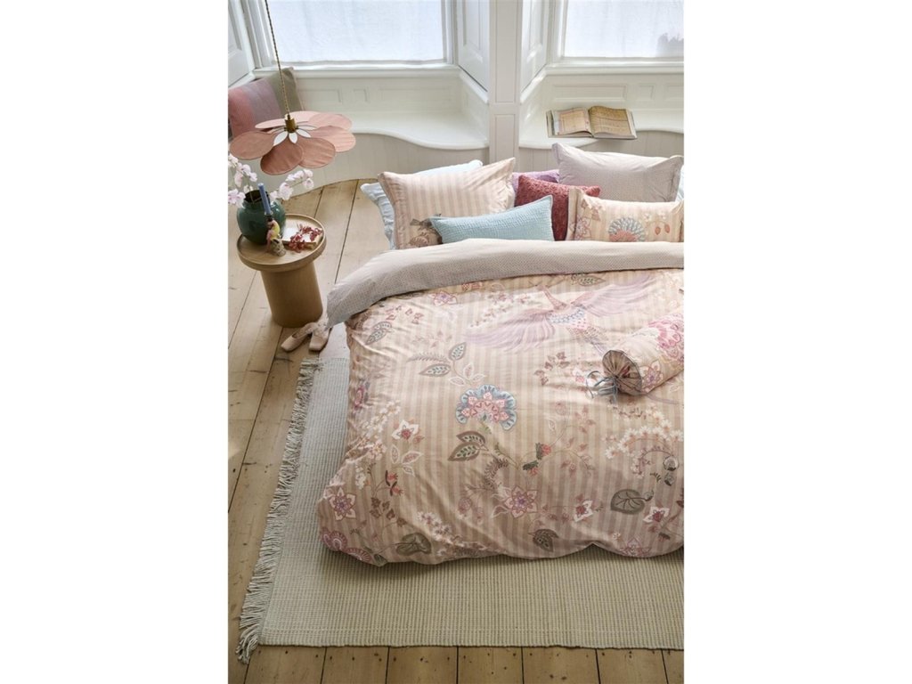 Pohádkové povlečení Pip Studio Buenas Noches v béžových a pískových tónech s květinami, ptáčky a volavkou. Z druhé strany zdobí jemný geometrický motiv. Vyrobeno z luxusního bavlněného perkálu 200TC – hebké, prodyšné a elegantní. Na jednolůžko.