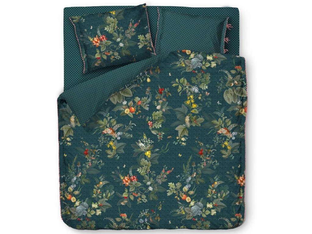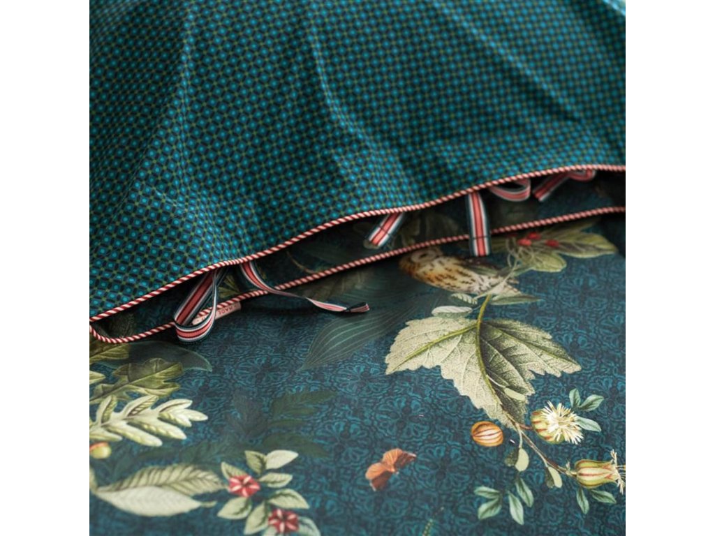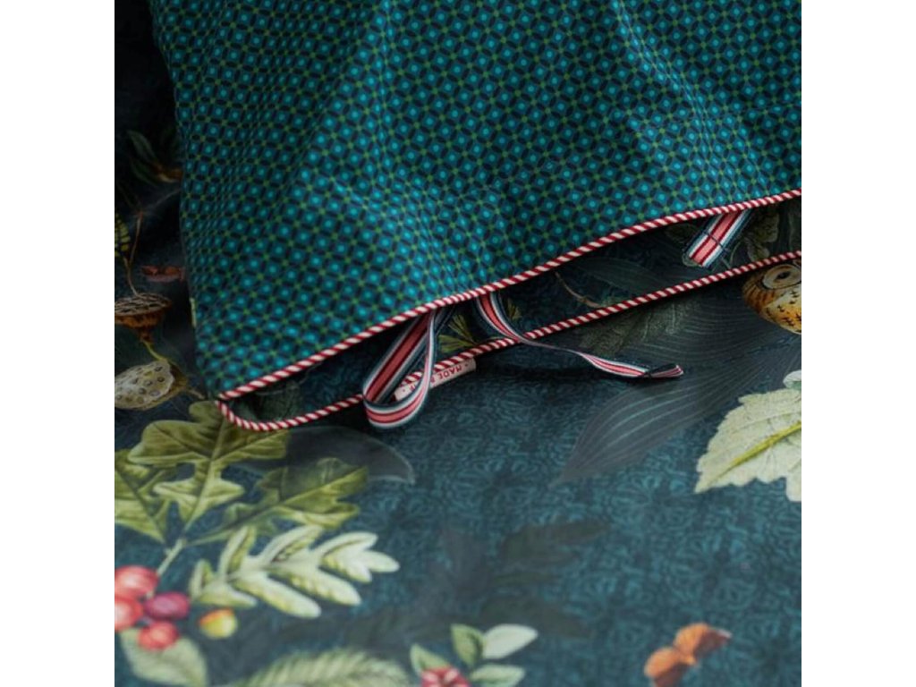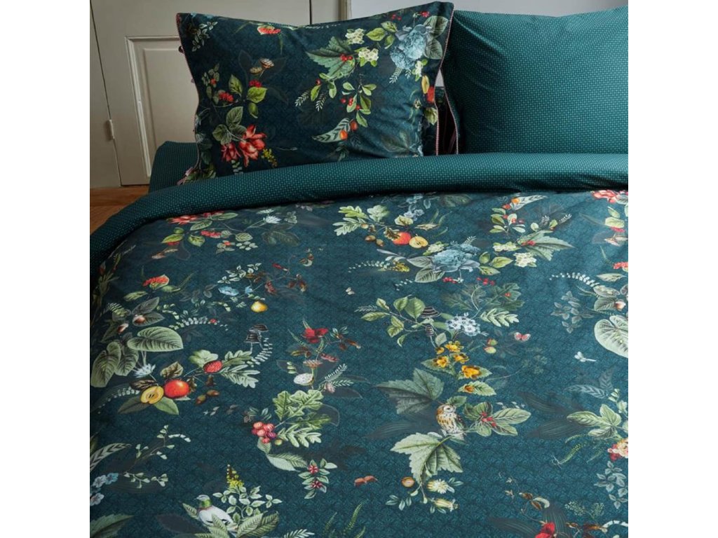 Pip Studio Fall in Leaf – luxusní modré bavlněné povlečení s bohatým vzorem květin, plodů a zvířat, doplněné decentním geometrickým motivem na zadní straně.
