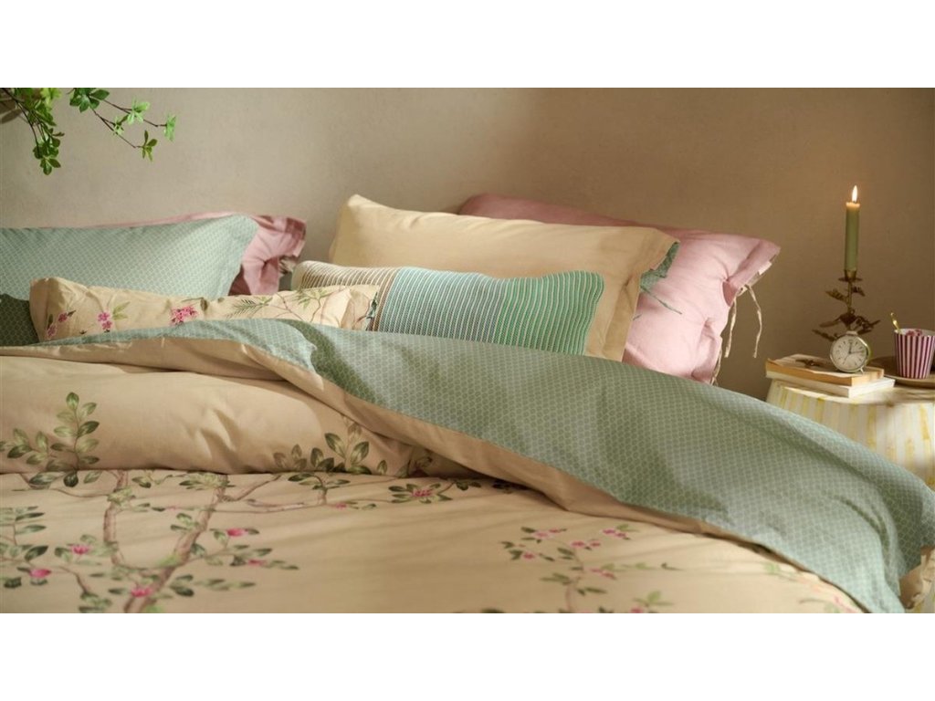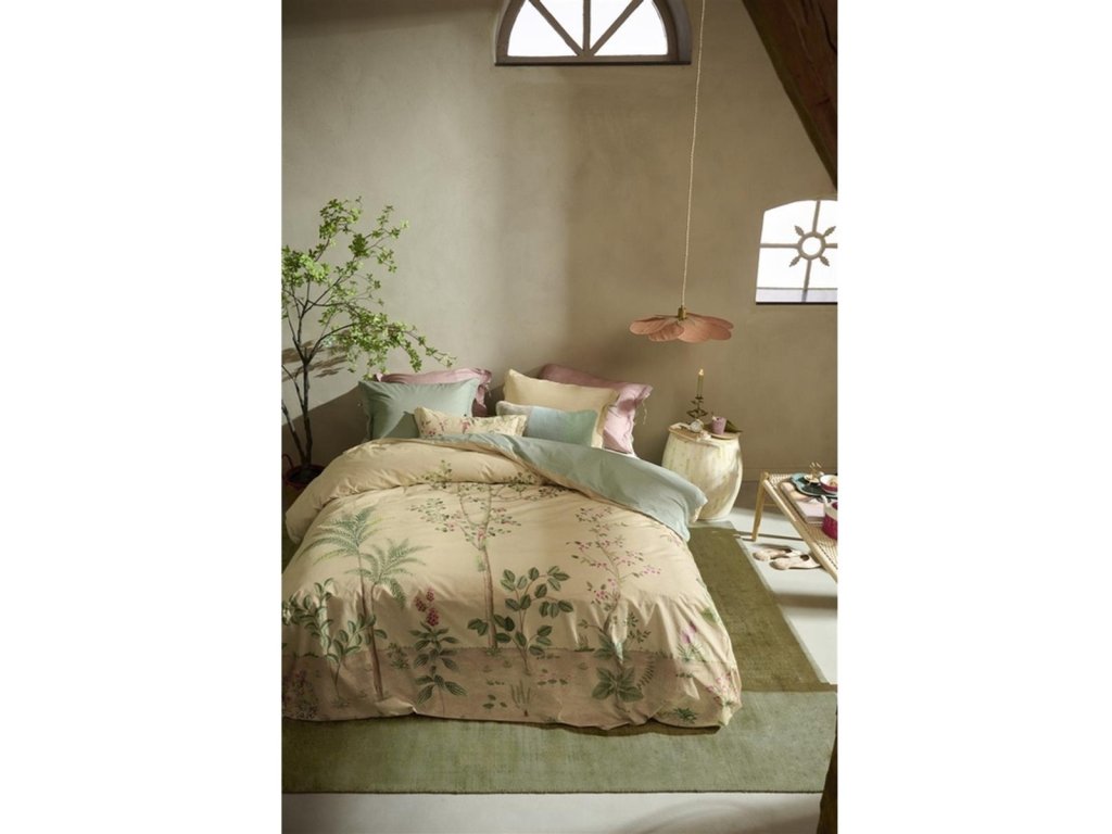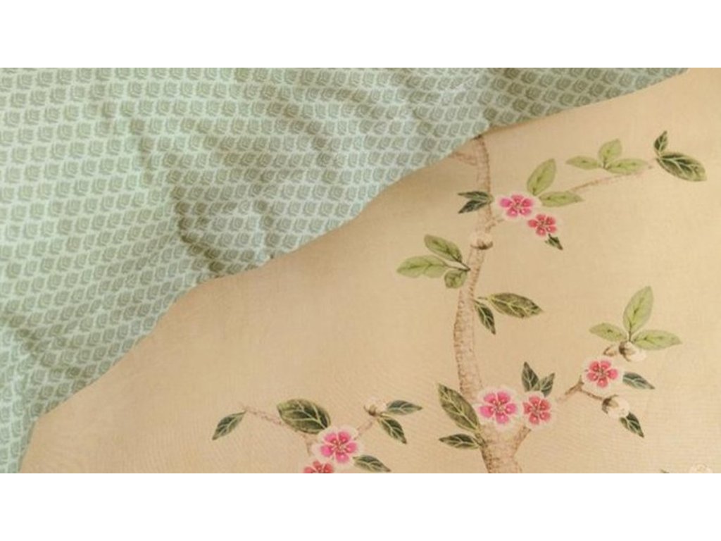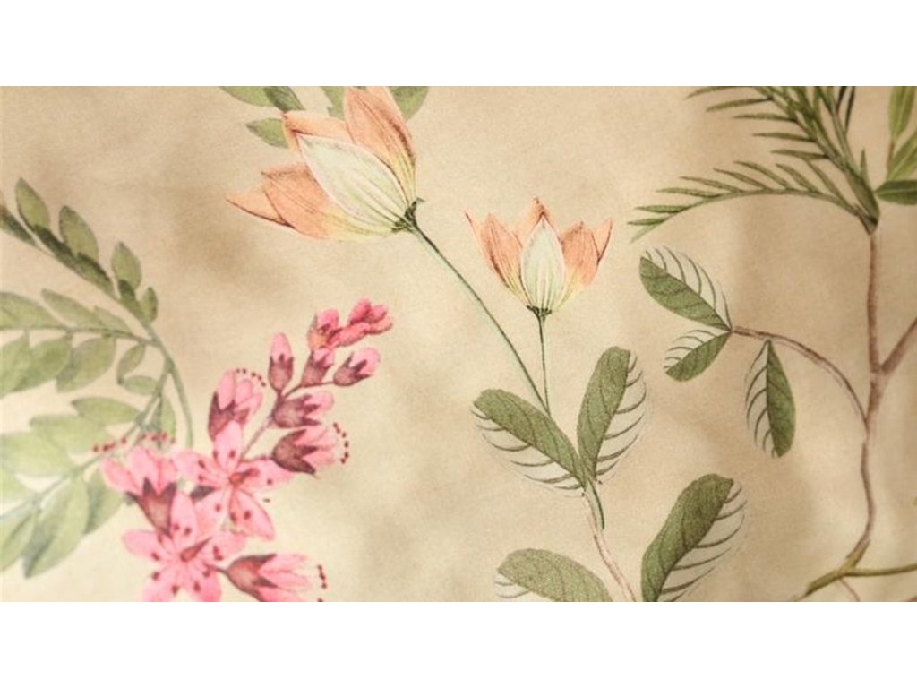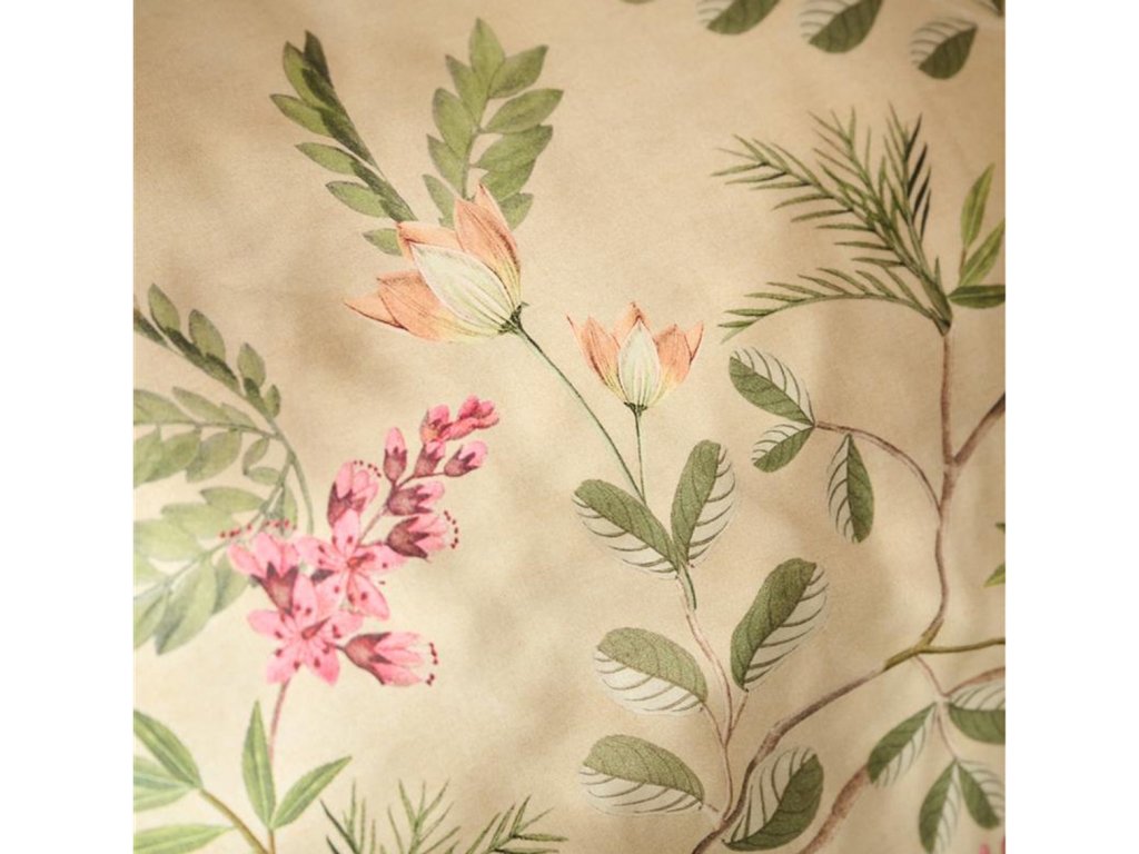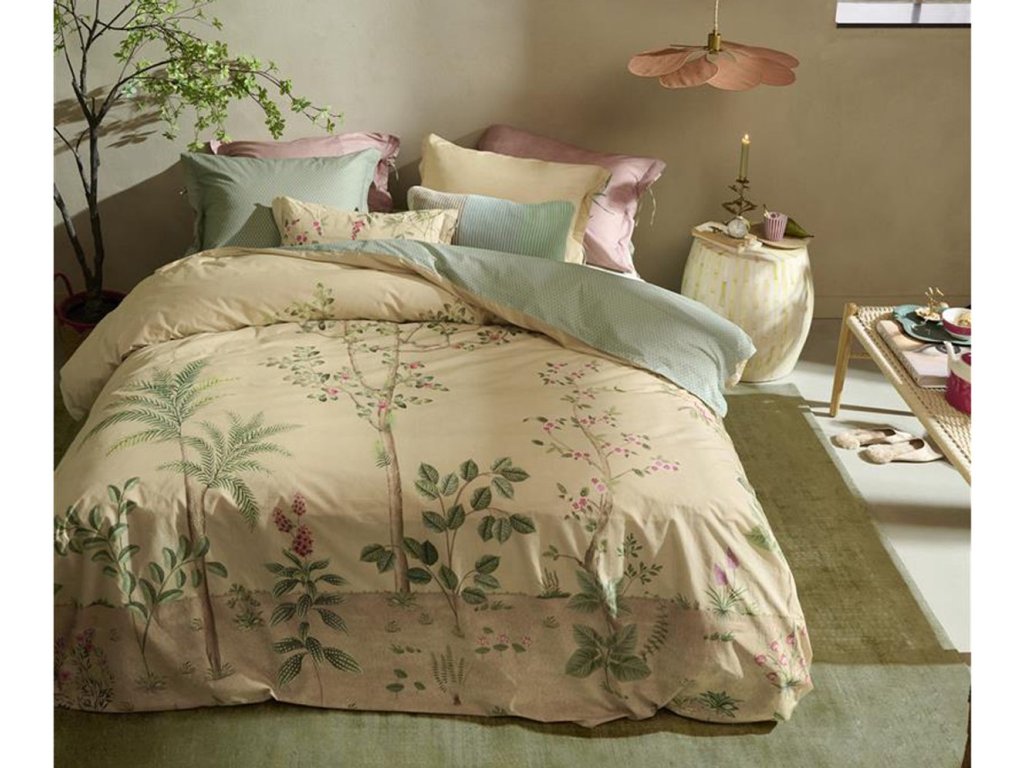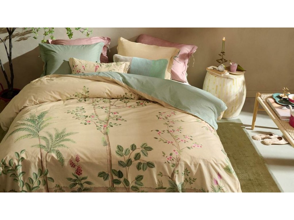 Povlečení z kolekce Pip Studio Fata Morgana v béžovo-pískové barvě tvoří základ pro něžný a romantický design. Dominantním prvkem je překrásný strom s červeno-bílými květy, obklopený fantaskními rostlinami a květinami, které vytvářejí dojem růžové zahrady v oáze.
