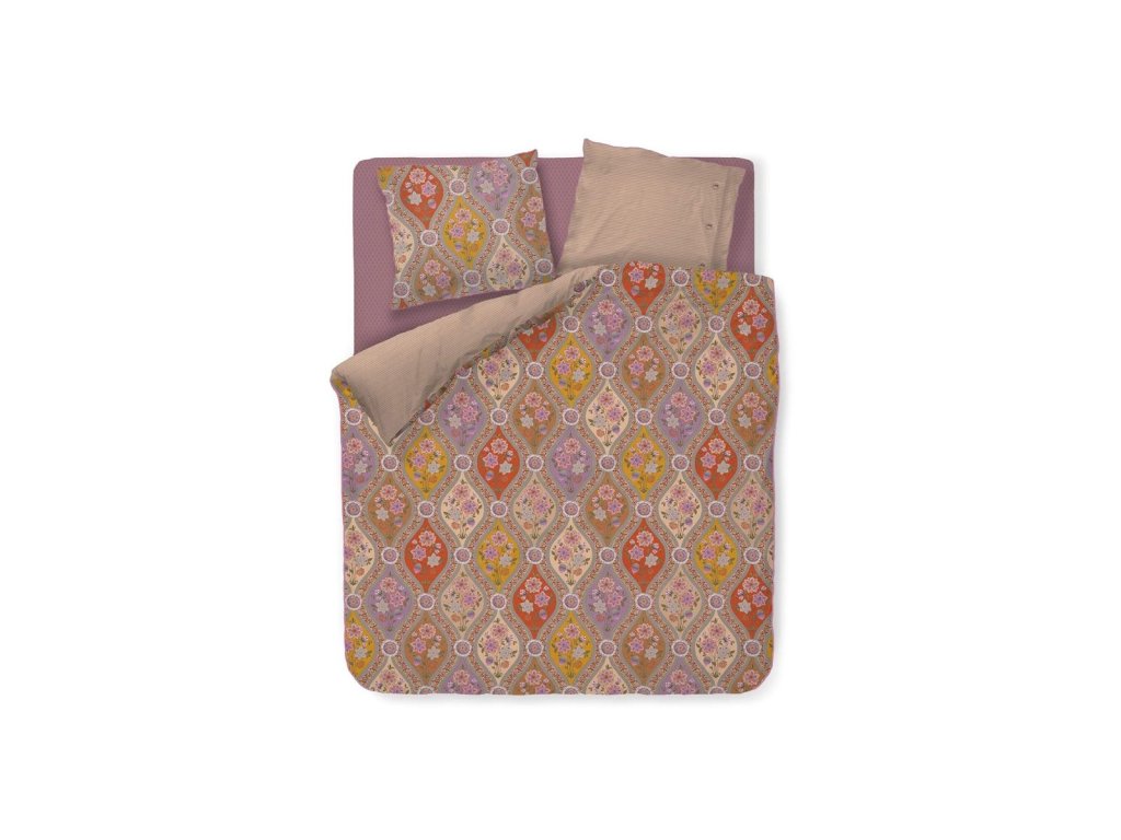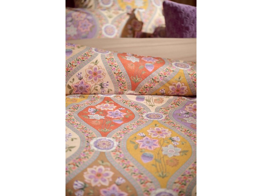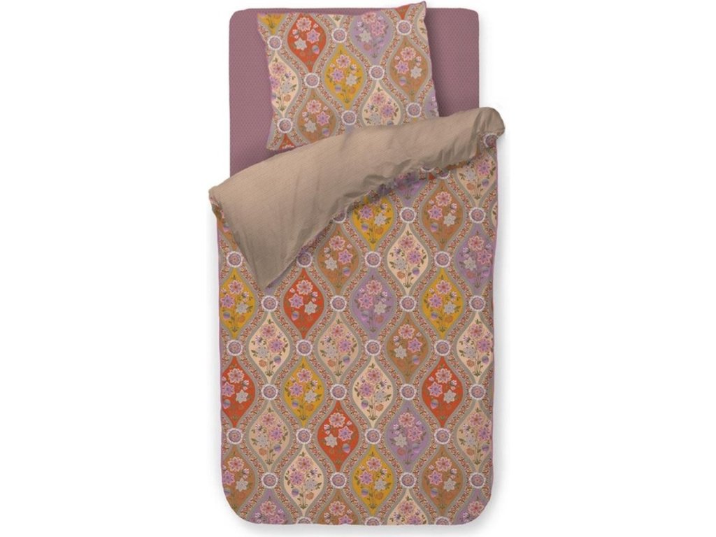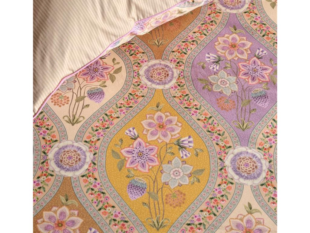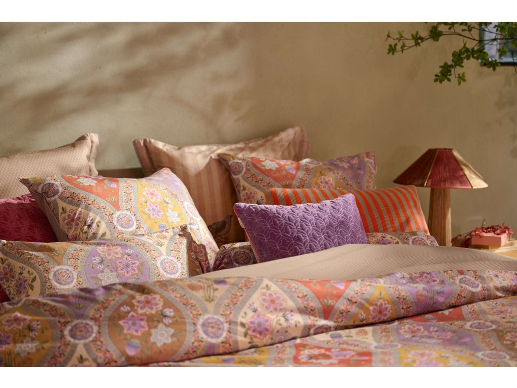 Povlečení Pip Studio Ornamento Ramo je inspirované španělskými florálními motivy, které propojují bohatý ornamentální styl s jemnou elegancí. Dominantní květ lotosu je zakomponován do mozaikového vzoru, jenž působí harmonicky a přitom výrazně. Teplé barvy povlečení vytvářejí útulnou atmosféru a přinášejí do ložnice hřejivý středomořský nádech. Zadní strana povlečení je zdobená jemným pískovým proužkem, který design krásně zjemňuje.
