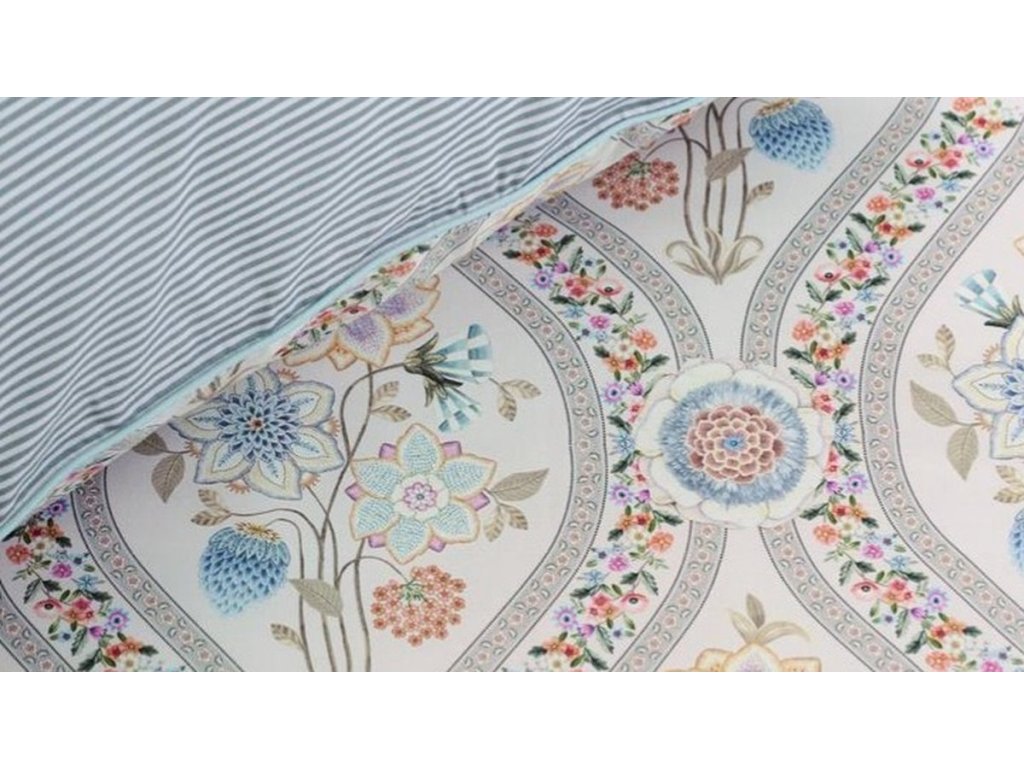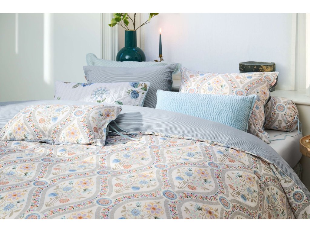 Povlečení Pip Studio Ornamento Ramo je inspirováno španělskými květinovými motivy a zaujme dominantním lotosovým květem zasazeným do jemného mozaikového vzoru. Decentní světlé barvy přinášejí do ložnice pocit svěžesti a elegance, zatímco zadní strana povlečení s jemným proužkem ve světle modré barvě dodává designu lehkost a harmonii.