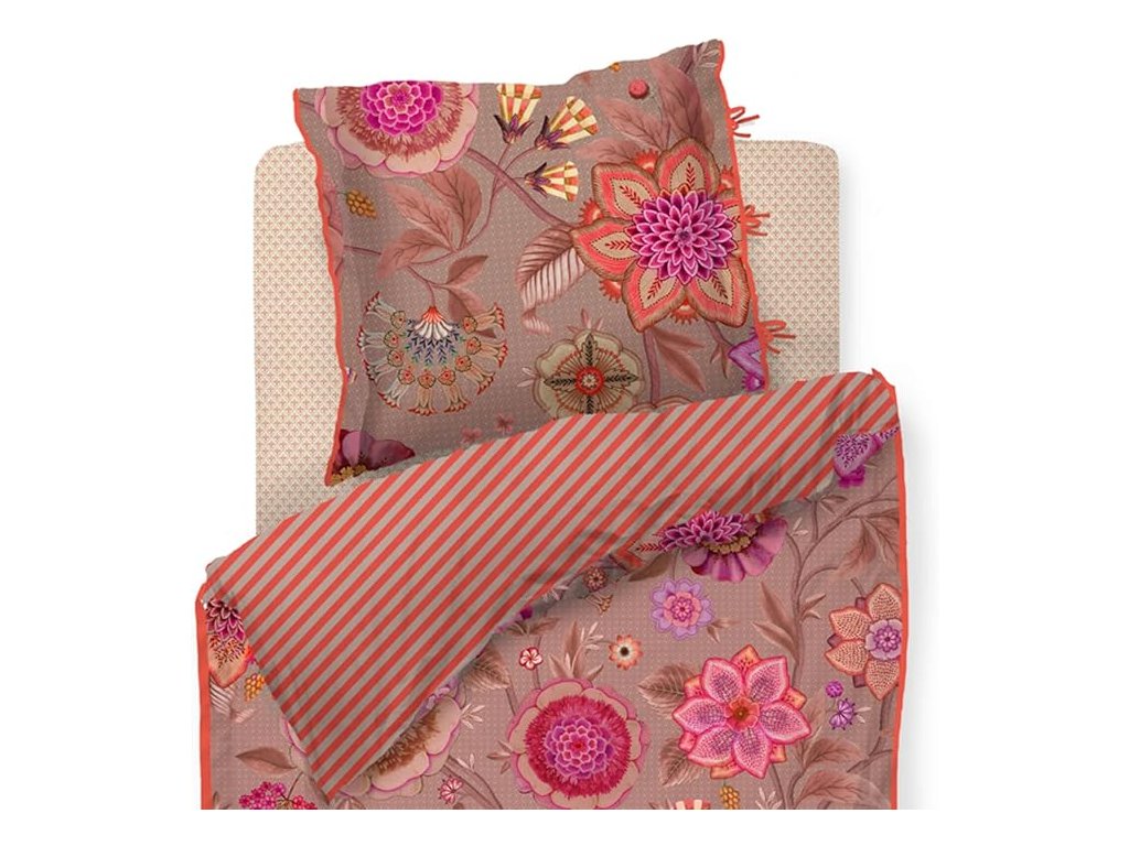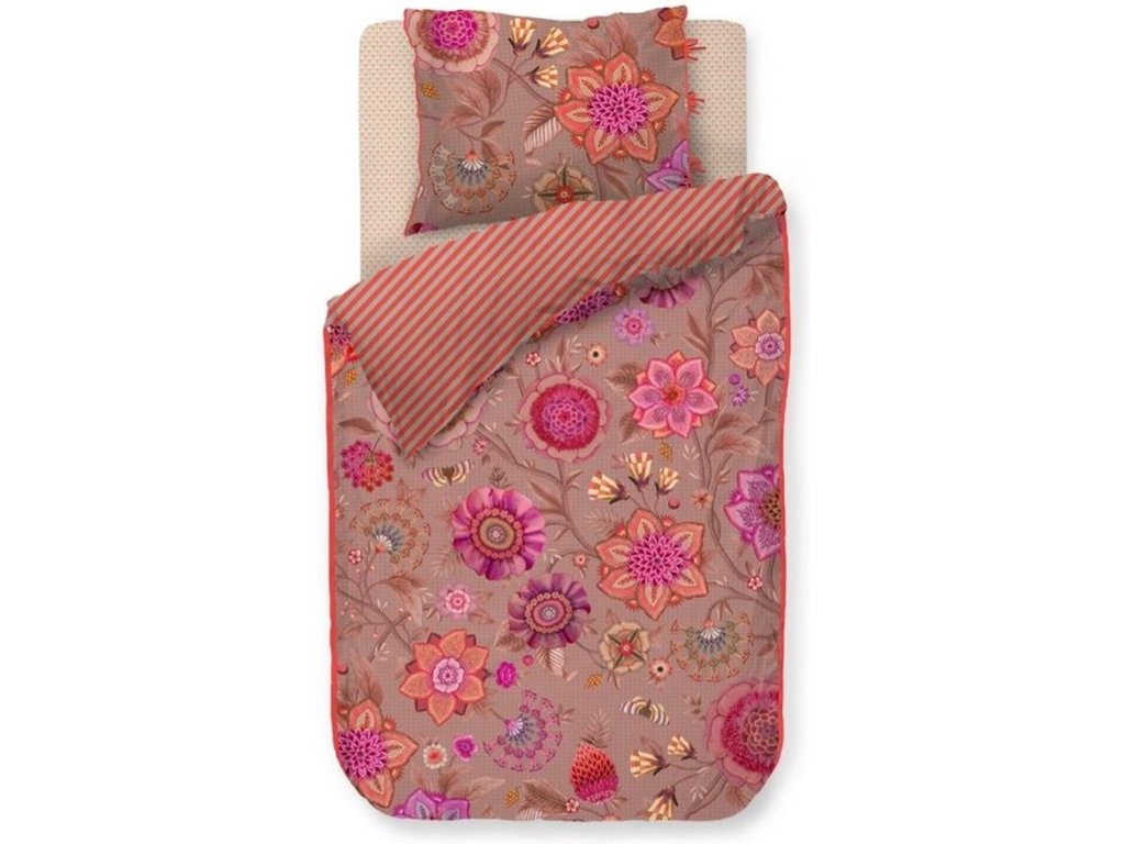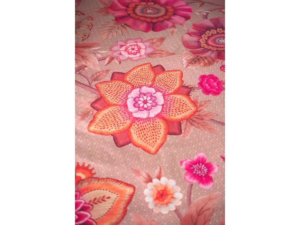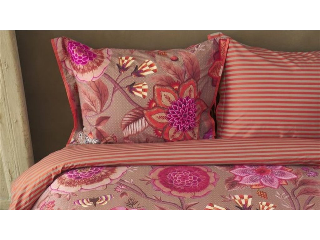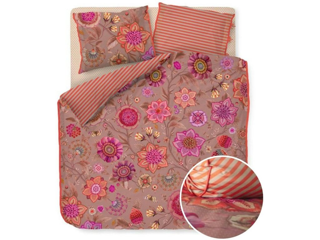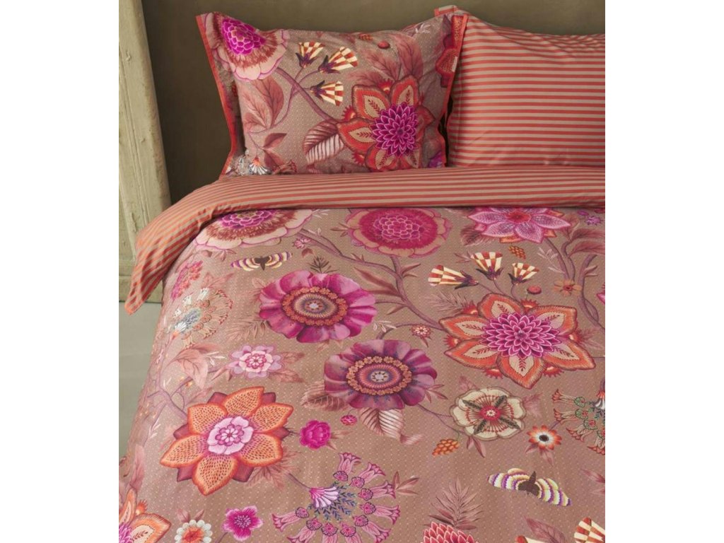 Pip Studio povlečení Viva La Vida je oslavou barev, života a radosti. Je nepřehlédnutelným klenotem ložnice. Velkorysé květinové motivy v extravagantních barvách propojují fantazijní růže, mučenky a jiřiny, inspirované bohatě zdobenými květinovými stěnami španělských měst. Přední strana hraje barvami a energií, zatímco zadní strana překvapí jemným pruhovaným vzorem, který umožňuje měnit atmosféru ložnice podle nálady. Luxusní lemování decentním kulatým paspolem dodává povlečení elegantní a precizní vzhled.