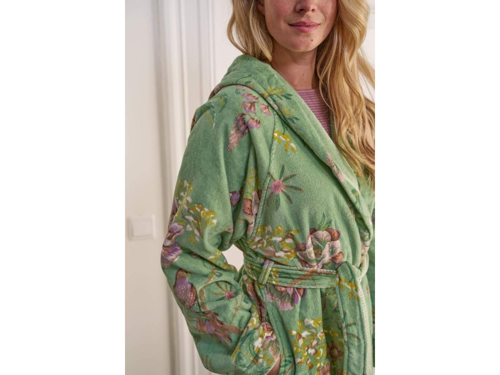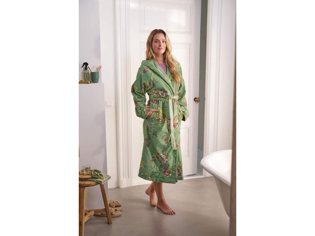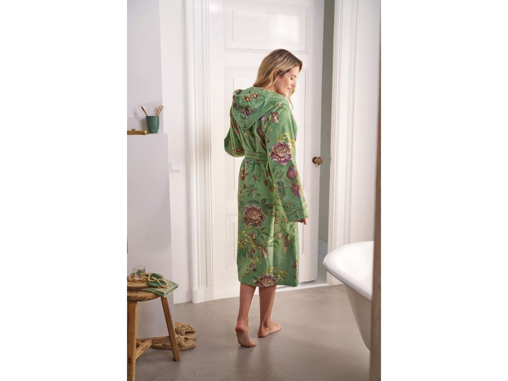 Luxusní župan Pip Studio Secret Garden z měkkého a savého bavlněného froté s kapucí a páskem. Elegantní zelený design pro dokonalý komfort každý den.